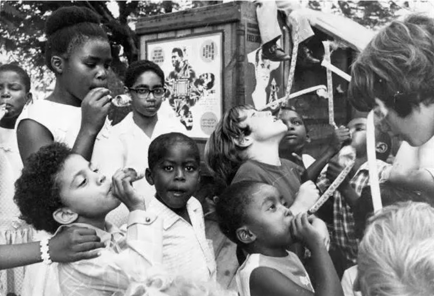 ‘Blowing bubbles distracts these children from the war poster behind them.‘ Front page of the Tanzania Standard, June 1971.